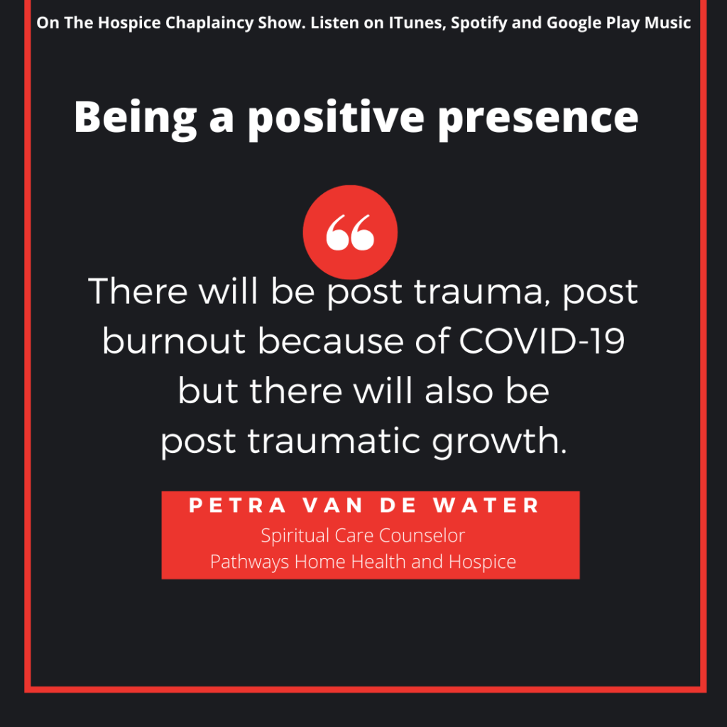 Due to the pandemic, the Hospice Chaplaincy Show hosts Joe Newton and Saul Ebema remotely interview our guests, Rev. Kathy O’Donoghue who works as the chaplain at Norwell VNA and Hospice in Massachusetts, Rev. Petra Van De Water who works as the Spiritual care counselor at Pathways Home Health and Hospice in California and Dr. Claire Gray who works as the Spiritual Care Manager at Pathways Home Health and Hospice in California.